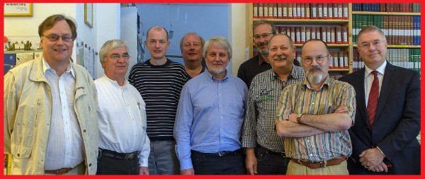 Nach einem wappenrechtlichen Grundsatzreferat des Juristen Dieter Müller-Bruns (Mitte) sprach sich der Vorsitzende des Heraldischen Vereins, Herr Hans-Peter Dege (2.v. li.), für die weiterhin vorrangige Anwendung des Namens- und Nachkommenschaftsprinzips bei der Arbeit der Niedersächsischen Wappenrolle aus.