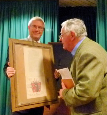 Der Vorsitzende Peter Dege und sein Stellvertreter Dr. Volkmar Tönnies freuen sich über die Einweihung der neuen Präsenzbibliothek des Heraldischen Vereins "Zum Kleeblatt" in der Rückertstraße 1, Hannover.