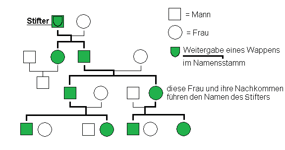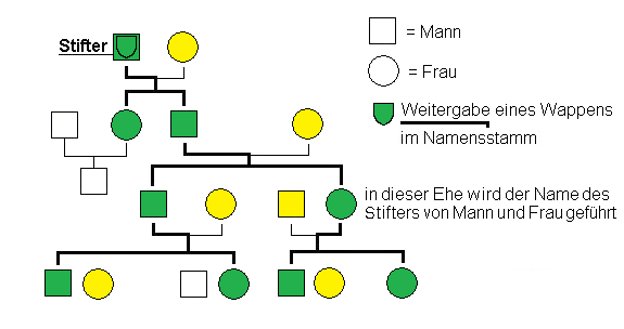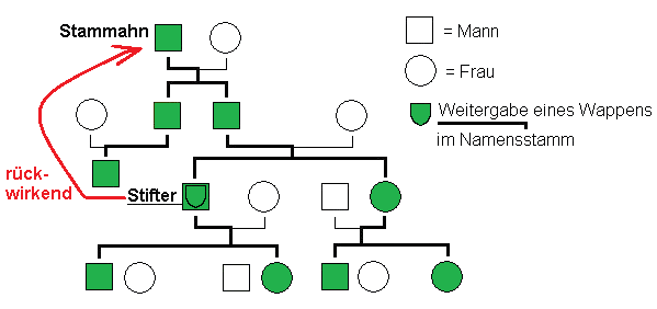 Das folgende Schaubild verdeutlicht die Führungsberechtigung nach dem Namens- und Nachkommenschaftsprinzip. Es beinhaltet nach dem Verständnis des Heraldischen Vereins "Zum Kleeblatt" den sog. Namensstamm. Jede Person mit einem grünen Symbol erhält das Familienwappen von einem zur Führung und Weitergabe berechtigten - also selber aktiv den Familiennamen führenden - natürlichen und rechtlichen Nachkommen der wappenstiftenden Person.